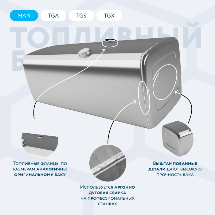 Алюминиевый бак не подвержен коррозии, что делает его более долговечным, а так же сбережет вашу топливную систему. Бак из алюминия в два раза легче стального бака, хотя он и изготовлен из листа увеличенной толщины в 2,5 мм. В конструкции предусмотрены цельные перегородки, которые проварены по периметру. Баки из алюминия так же оснащены заливной горловиной с самозапираемым непроливаемым клапаном (который становится барьером для разлива топлива, а так же становится защитой от попадания мусора в бак при открытой крышке) . Кроме того, однозначно что алюминиевый бак выглядит намного привлекательнее и дороже - где бак в том числе становиться и элементом тюнинга автомобиля. На алюминиеввые баки действует увеличенная гарантия - 36 месяцев.